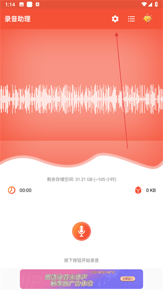 1、打开录音助理应用,点击界面右上角齿轮形状的设置图标,进入设置页面。