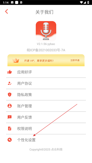 3、在关于我们页面里,找到个性化设置选项并点击,进入个性化设置界面。