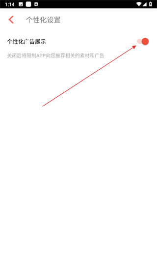 4、在个性化设置界面中,找到个性化广告展示选项,点击其右侧的开关按钮。