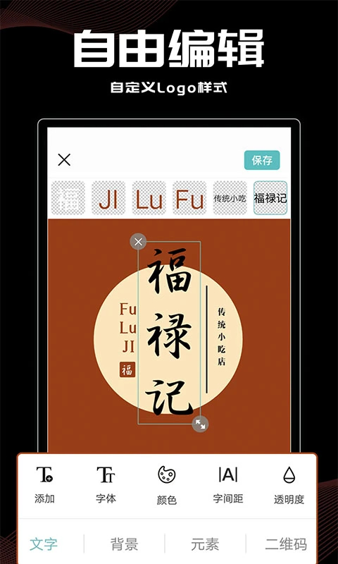 第二步:选择logo后,可以在编辑页面修改添加背景、字体、元素,创作独一无二的专属logo。