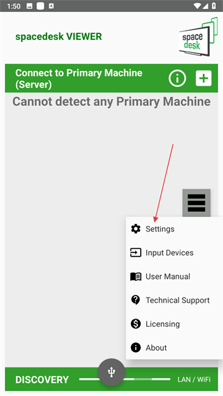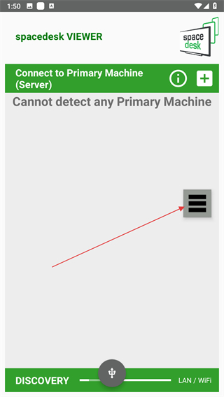 1、打开spacedesk VIEWER应用,界面右侧有三横线菜单按钮,点击该按钮。