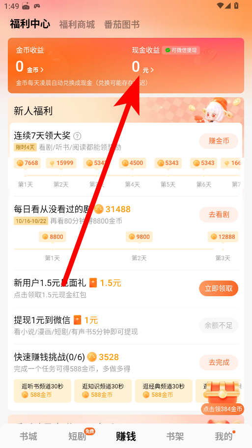 1、打开番茄免费小说APP,点击底部导航栏中的赚钱选项,进入福利中心页面。