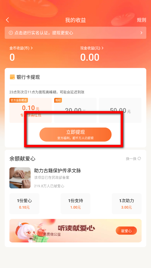 3、在我的收益页面,确认收益金额满足提现条件后,点击立即提现按钮,按照提示完成提现操作。