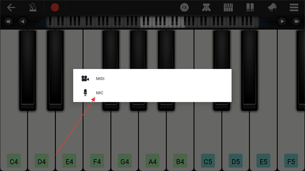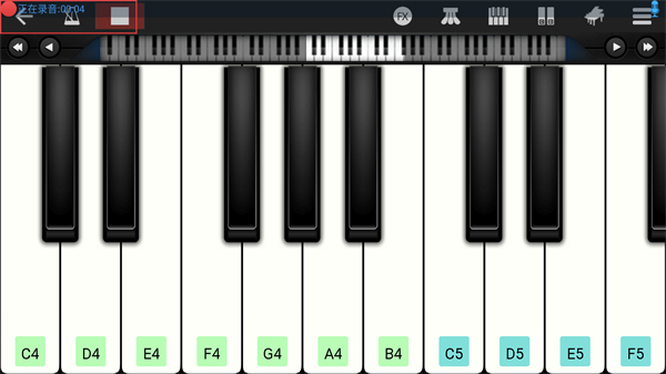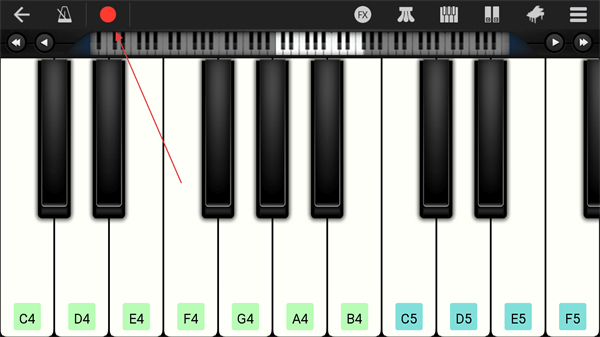 2、进入钢琴的页面内,点击上方录音的功能按钮。