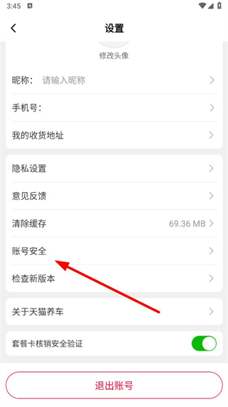 3、在设置页面,点击账号安全选项,进入账号安全页面。