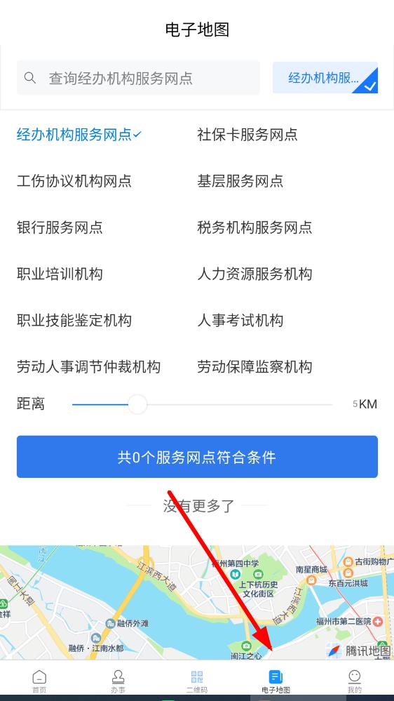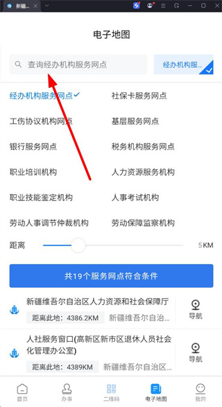 2、在电子地图页面,可在搜索框输入要查询的经办机构服务网点,或选择相关机构类型。