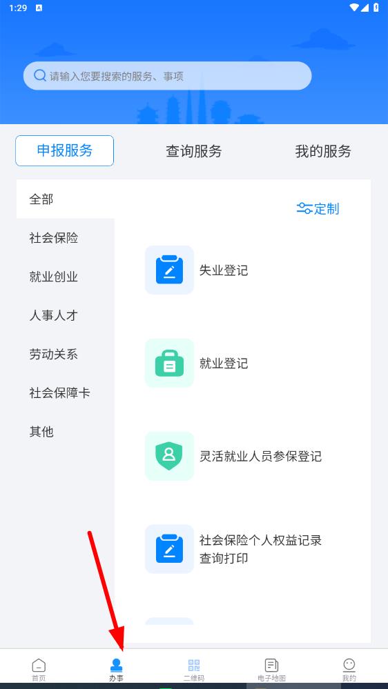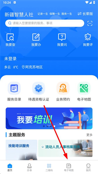 1、打开新疆智慧人社app,点击底部导航栏中的电子地图选项。
