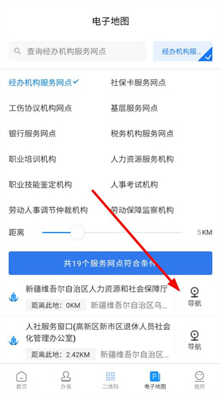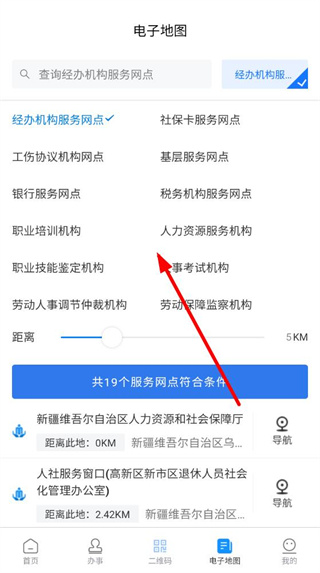 3、点击底部电子地图,可查询经办机构服务网点、社保卡服务网点、工伤协议机构网点等各类与人社服务相关的网点,推荐附近符合条件的网点地图导航。
