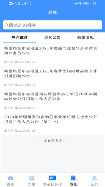 用户可以使用这款软件完成社保查询、就业查询,完成社会保险待遇资格认证,部分地区可办理新参保、停保、续保、银行账号变更等业务,实现足不出户办理人社业务。