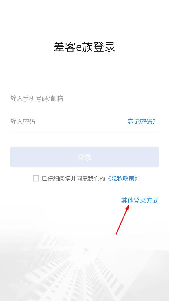 1、打开差客e族软件,在登录界面点击“其他登录方式”,进入其他登录选择页面。