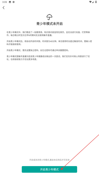 4、进入青少年模式的页面内,阅读后点击开启青少年模式。