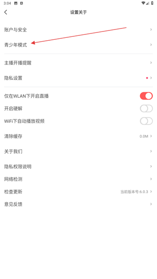 3、在设置关于的页面内,点击青少年模式的功能按钮。