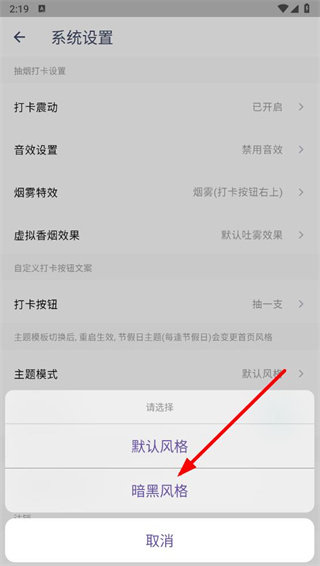 4、在弹出的选择框中,点击暗黑风格选项,完成黑暗模式切换操作。