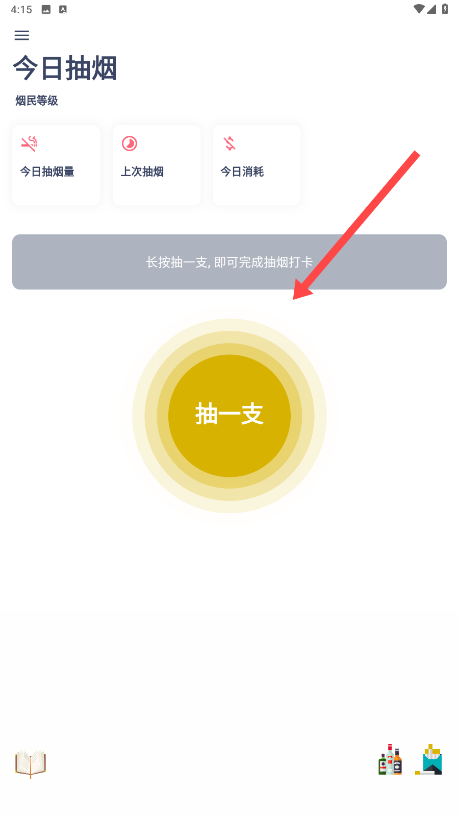 2、登录后进入主界面,即今日抽烟页面,当抽一支烟时,长按界面中间黄色的抽一支按钮,即可完成抽烟打卡操作。