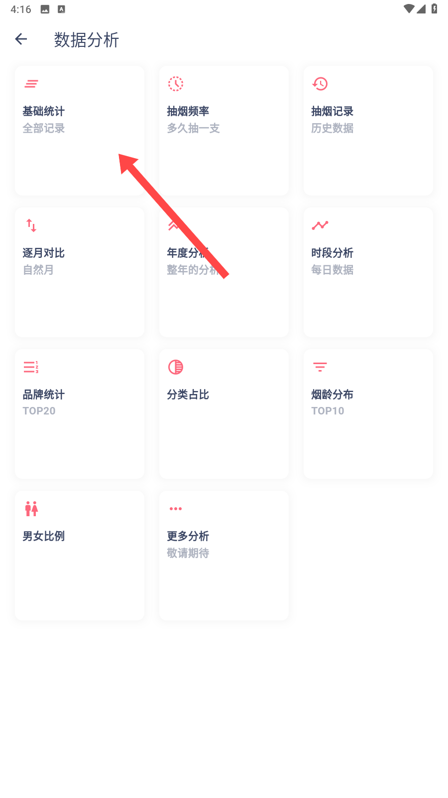3、基础统计涵盖全部抽烟记录,清晰罗列每次抽烟时间、数量,让抽烟间隔直观呈现,帮用户察觉成瘾节奏。