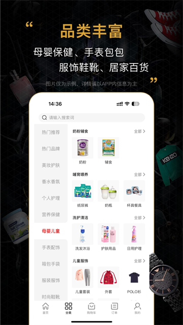 1、品类丰富:美妆护肤、个人护理、手表配饰、箱包手袋、服装服饰、时尚鞋靴、母婴儿童、营养保健八大品类;