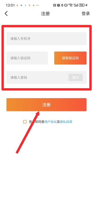 4、在注册页面,依次输入手机号等信息,点击注册完成账号注册。