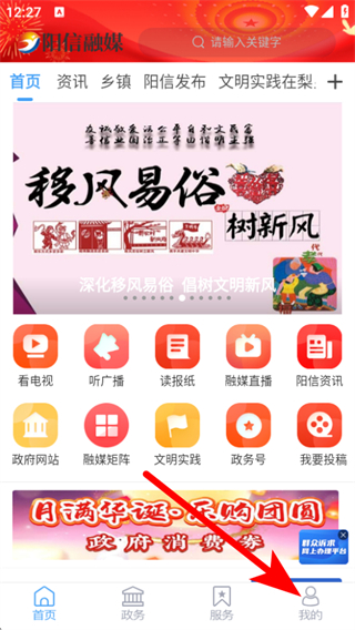 1、在阳信融媒首页,点击底部我的按钮,进入个人的页面。