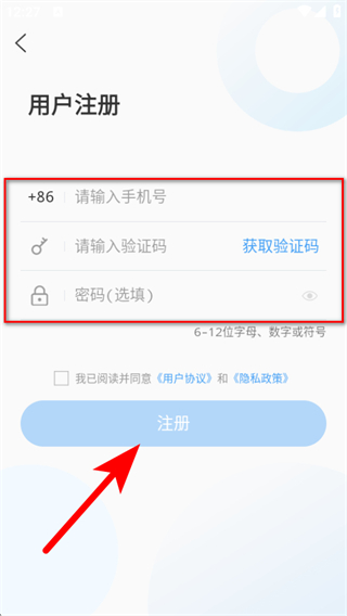 4、在页面输入手机号并填写验证码,点击注册完成账号注册操作。