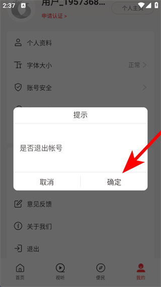 3、在退出提示框中,点击确定,完成账号退出登录操作。