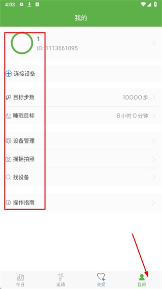 4、在我的页面,可以进行连接设备、设置目标步数和睡眠目标、设备管理、摇摇拍照、找设备以及查看操作指南等操作。
