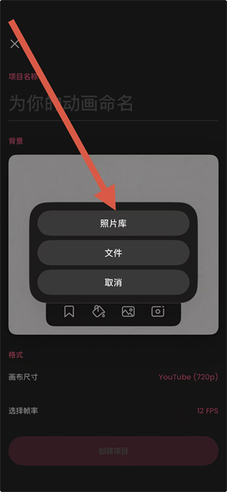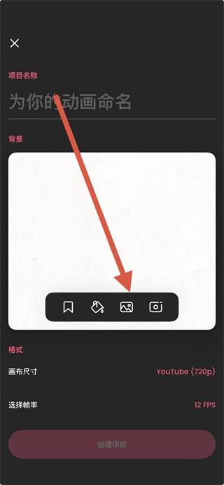 2、进入项目创建页面,完成项目名称填写等基础设置后,点击背景选项处的图标按钮,准备选择背景图片来源。