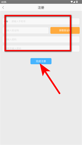 4、在注册界面,输入信息后点击完成注册按钮,即可完成账号注册。