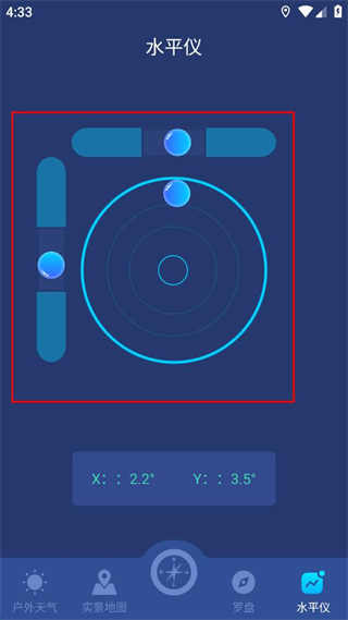 3、在水平仪界面,可查看X、Y轴的角度,判断物体是否水平。