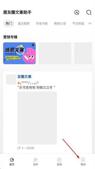 朋友圈文案助手app里面拥有海量高品质精选文案内容,各种不同风格类型文案应有尽有,分类一目了然方便小伙伴们查找观看,是一款十分受用户欢迎的朋友圈文案生成手机软件,每天都会实时更新最新精美内容,都是免费提供使用的。