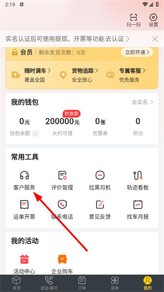 1、在我的个人页面找到客户服务入口,点击进入客户服务页面。