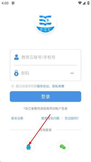 1、打开之江汇APP,在登录页面点击QQ登录图标。
