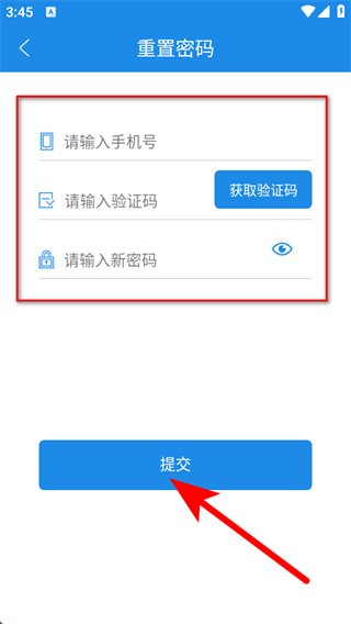 3、在重置密码页面,输入手机号等信息后,点击提交完成修改。
