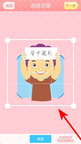 3、在选择范围页面中,调整选框大小选择图片范围,点击下一步,进入图片编辑页面。