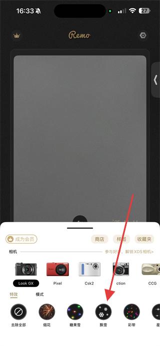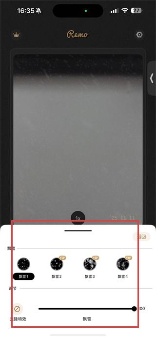 2、在视频拍摄模式下,选择喜欢的特效如飘雪特效,进入特效设置界面。
