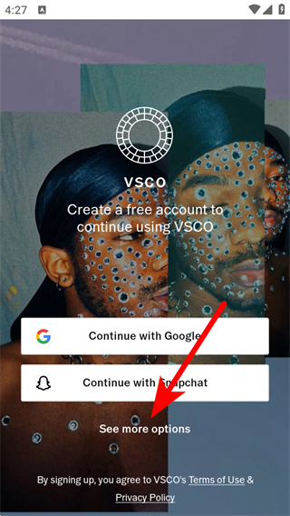 1、打开VSCO应用,点击See more options,进入账号注册选项页面。