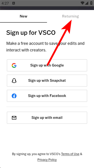 2、在账号注册选项页面中,点击右上角Returning标签,切换到登录/注册的返回用户界面。