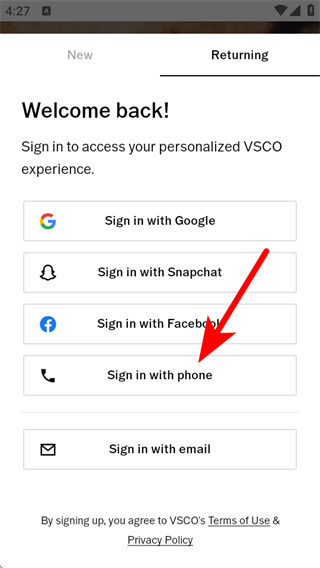 3、在返回用户界面中,点击Sign in with phone,进入手机号码输入页面。