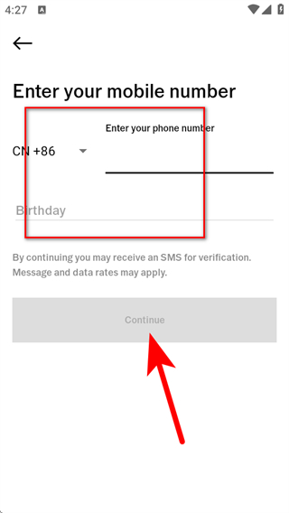 4、在手机号码输入页面中,输入手机号码,点击Continue,按照后续提示完成账号注册操作。