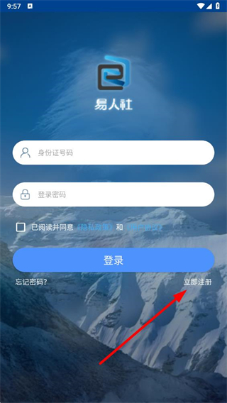 1、打开易人社app,在登录页面点击立即注册选项,进入实名注册页面。