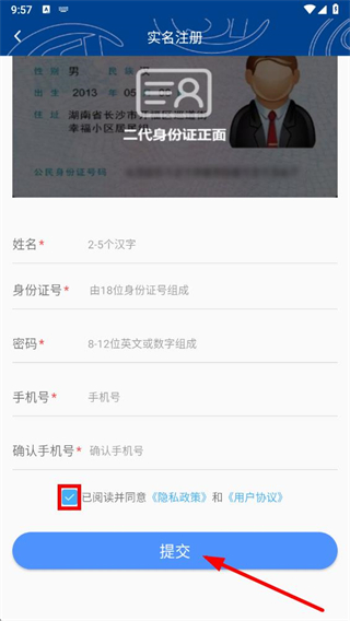 3、信息填写完成后,勾选已阅读并同意协议,点击提交按钮完成注册。
