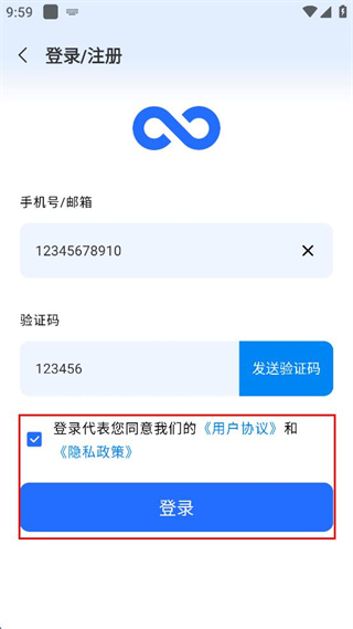 4、勾选同意用户协议和隐私政策,点击登录按钮完成登录操作。