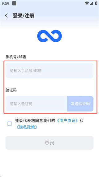 3、在登录/注册页面输入手机号/邮箱和验证码,准备登录。