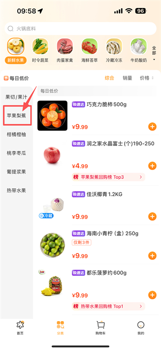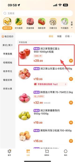 2、在分类页面,点击苹果梨蕉分类标签,进入苹果梨蕉商品列表页面。