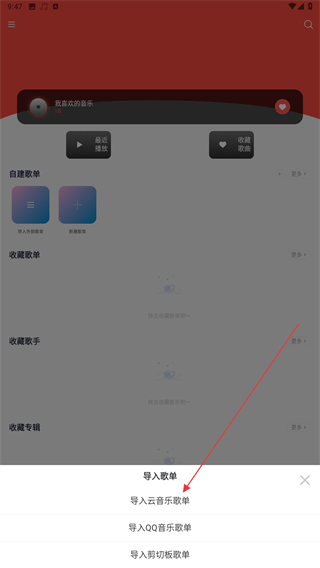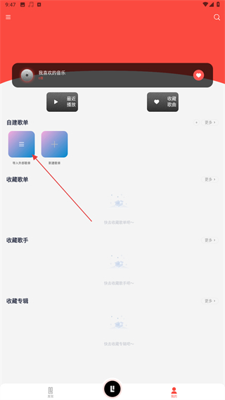 2、在个人中心的自建歌单板块,点击导入外部歌单按钮。