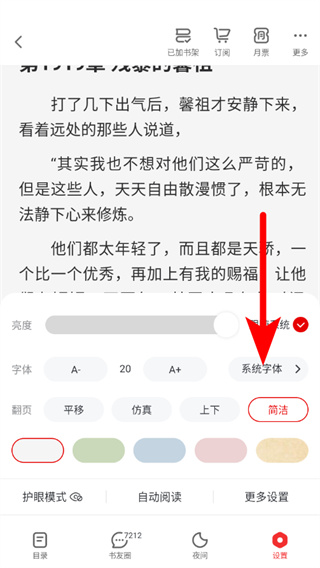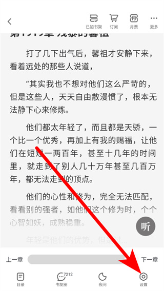 2、在小说阅读页,点击右下角设置选项,进入设置界面。