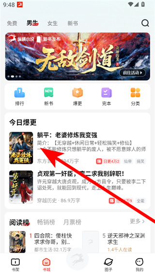 1、在纵横小说书城页面,点击要设置字体的小说,进入小说阅读页。