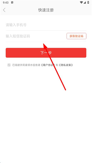 4、在快速注册页面,输入手机号和短信验证码,勾选同意协议后点击下一步按钮完成注册。