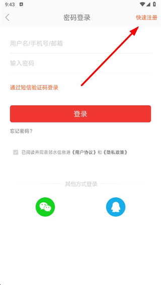 3、在登录页面,点击右上角快速注册选项,进入快速注册页面。