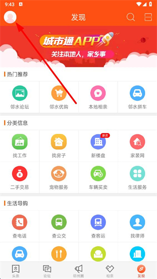 1、打开邻水信息港app,点击左上角头像区域,进入我的页面。