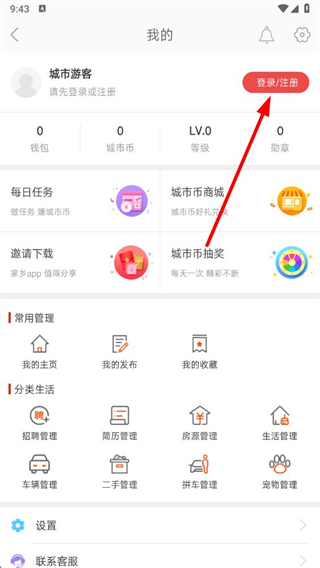 2、在“我的”页面,点击登录注册按钮,进入登录页面。